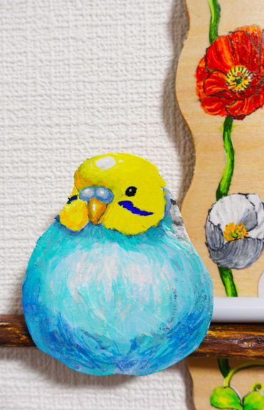 うちのセキセイインコのポピーちゃん(黄)と、seaちゃん(青)の愛らしい世界を描きました☆彡